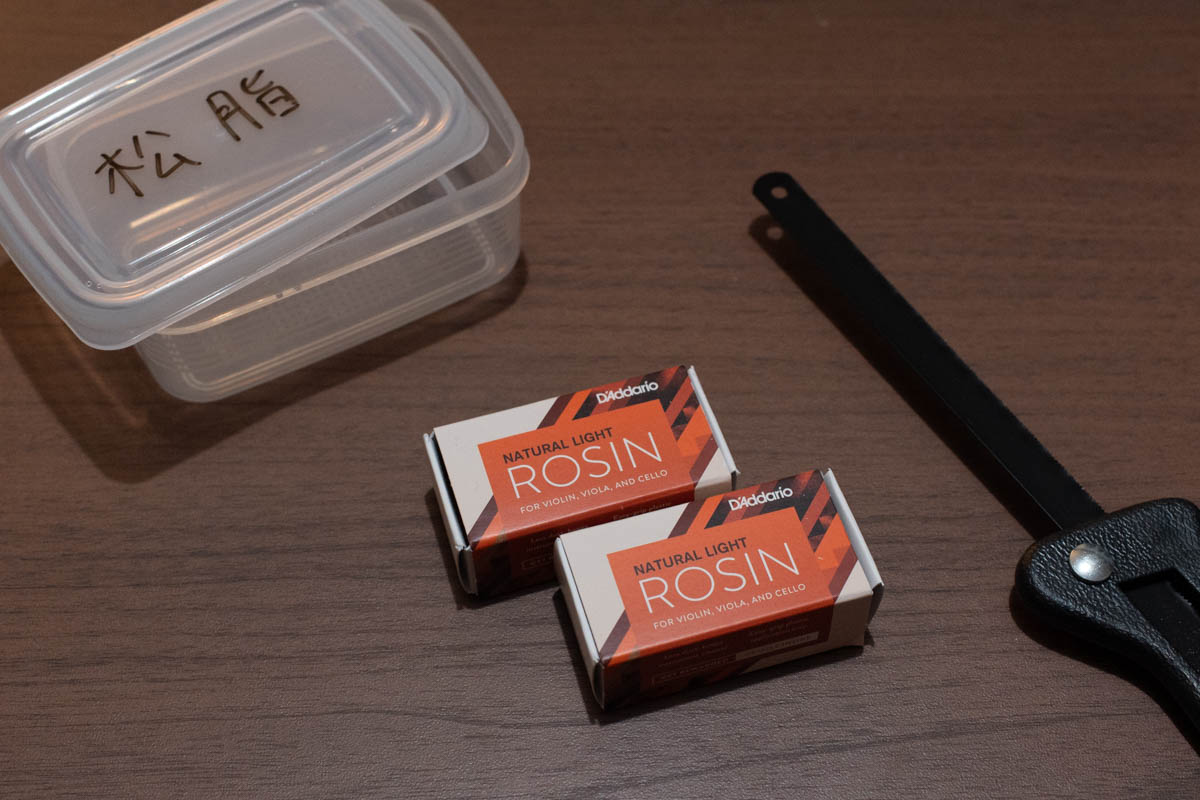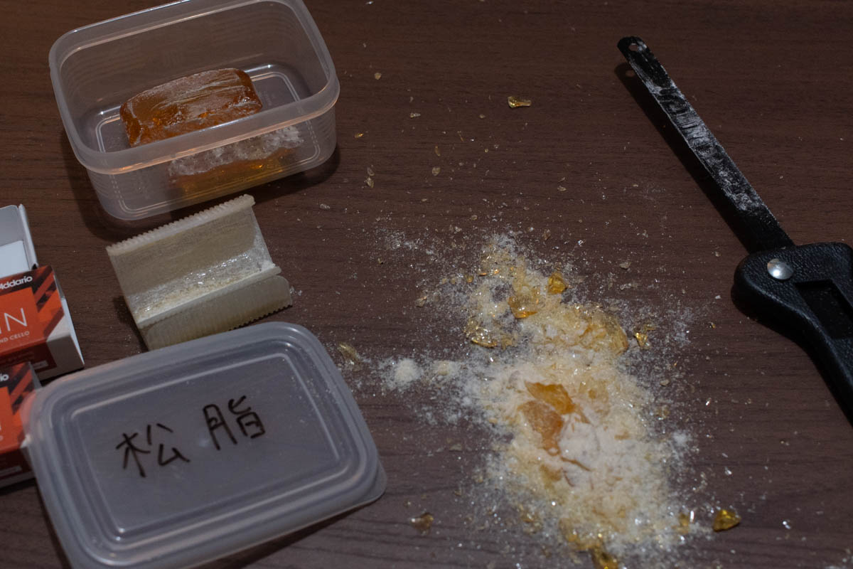 弦楽器用のレジンは音をよくするために混ぜ物があるので、本来はふつうに材料用の松脂を買った方がいいらしいです。あるいは高価ですが、画用材のベネチアテレピン(松脂をテレピン油に溶かしたもの)を買うという手もあります。