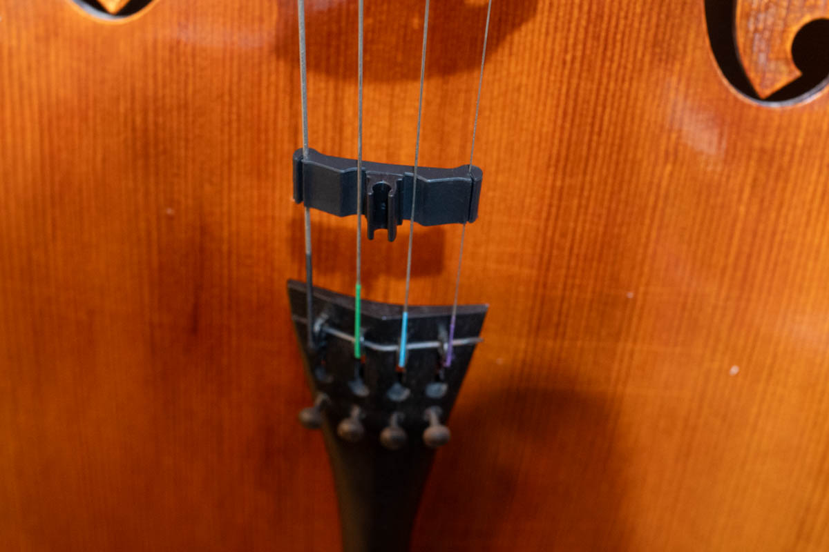 まずはチェロ取付用オプションのG-CLIP Celloをチェロの駒とテールピースの間に取り付けます。