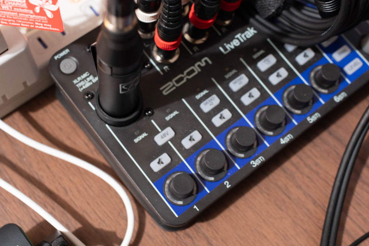 マイクの48V電源供給と録音は ZOOM LiveTrak L6 でいきます。