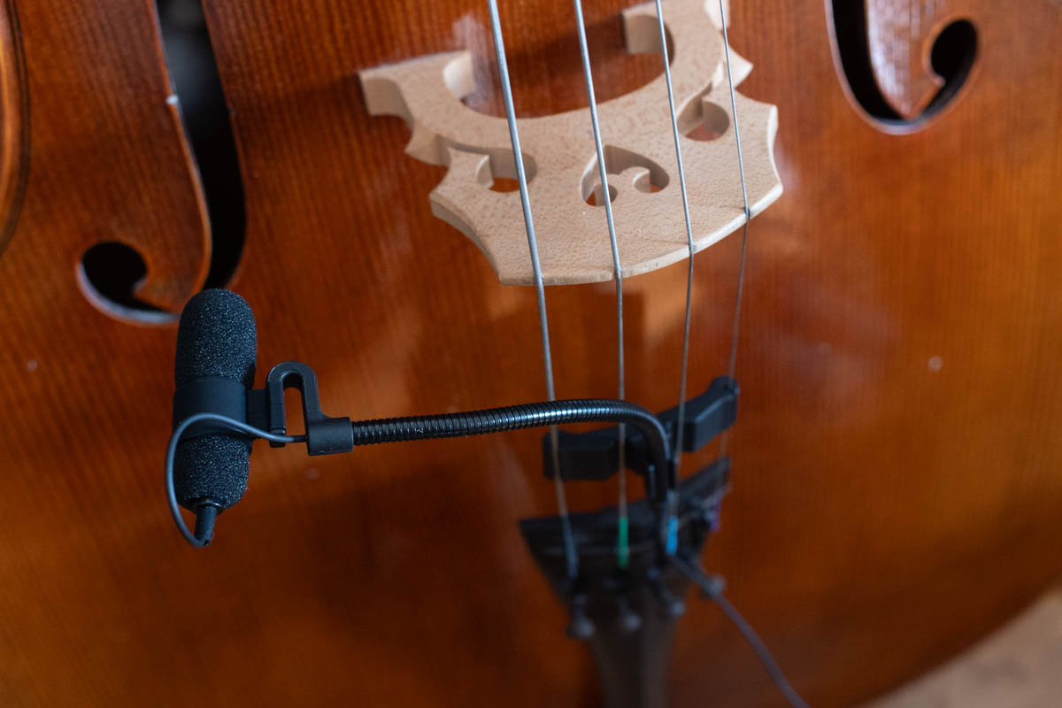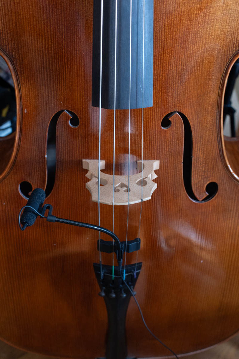 そして、クリップにマイクを取り付け。マイクの位置は駒の面、C線側のf孔の空中あたりにしました。